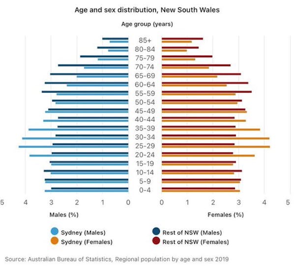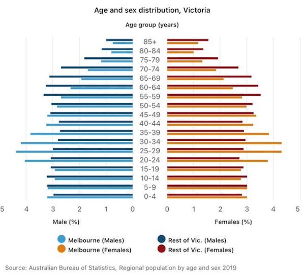 Is Victoria younger than New South Wales? No, median age and age distribution among the working age population (the most socially interactive group) aren’t all that different.