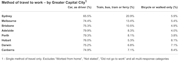 Do people in Melbourne travel around more than those in Sydney? No, the data doesn’t support that based on travel to work information.
