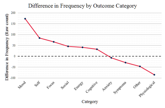 Difference in raw count of reported benefits and challenges. Positive values indicate greater endorsement of benefits; negative values reflect greater endorsement of challenges. Differences, regardless of magnitude, should be thought of as preliminary.